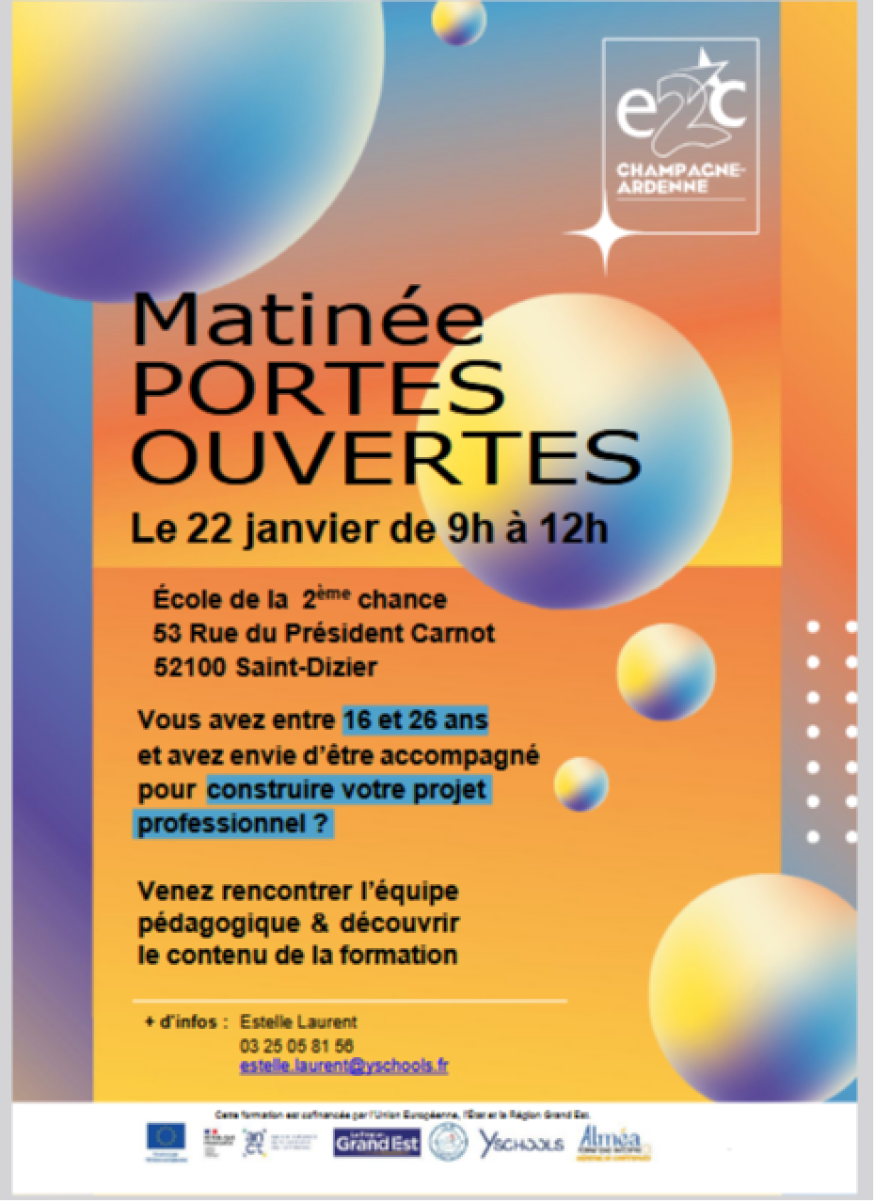 Les Écoles de la Deuxième Chance (E2C) continue d’offrir des solutions concrètes aux jeunes en quête de projet professionnel. L’équipe pédagogique de l’E2C Saint-Dizier vous invite à découvrir sa pédagogie innovante lors de sa matinée portes ouvertes ce jeudi 22 janvier 2026.